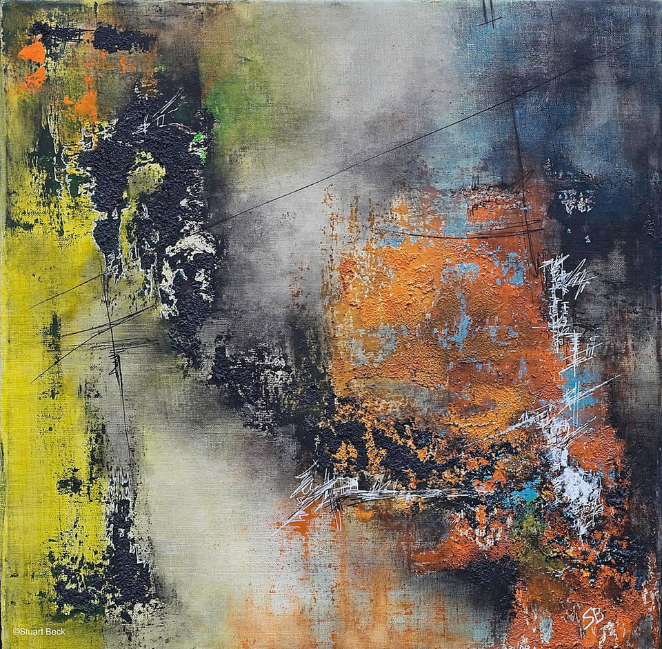 As a practical person, creating a piece of art inspires him to focus his efforts to present artwork that will be enjoyed and appreciated by others as well as the sense of personal fulfilment Beck gains from the experience. He follows a creative process to freely explore texture, colour and form without a definitive vision for the end result. This element of freedom is the hardest discipline to maintain, yet is a crucial part of the process. The early seeds of an idea will include the colours and a loose style for the painting. The creative development of a piece of art ebbs and flows until there is a natural sense that the work is complete. Beck takes time to ponder and observe during periods of work in order to reflect on the possibilities for what comes next and what the final outcome may be. Whilst some of his paintings are purely explorational, others are driven by personal feelings about life and the world around him. There is always a great concentration for Beck to remain dedicated to producing his own original abstract work.